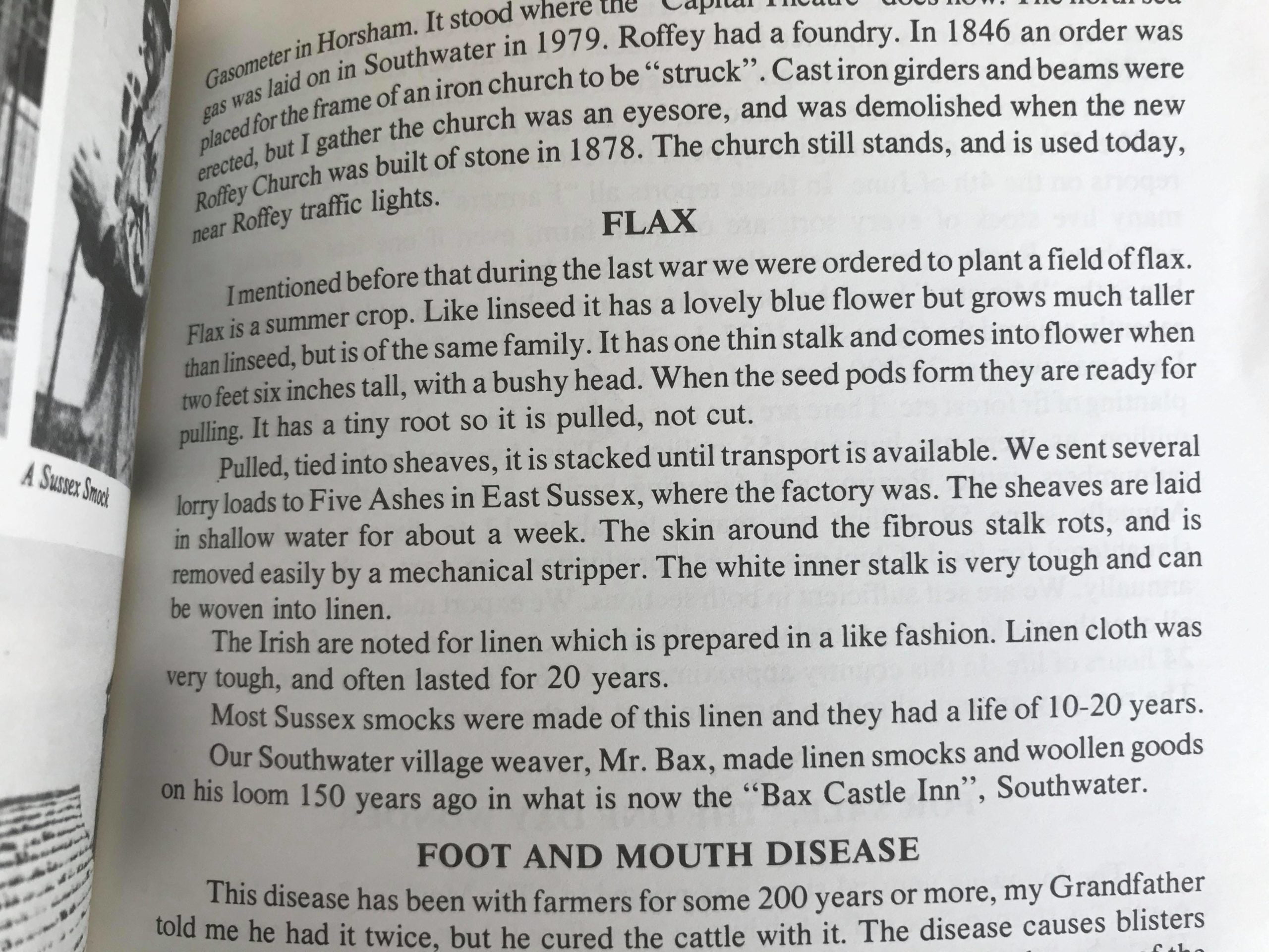 Sussex was never as famous as Northern Ireland for linen but has been grown here for possibly thousands of years. Shepherds of the Sussex Downs are always shown in hard-wearing linen smocks. Flax growing in the UK had declined with the coming of cotton. After the war flax was no longer grown in Sussex and the factory closed. The only flax growers that remained in the UK after the war were in Northern Ireland where its fine linen was famous worldwide. Since 2009 flax growing and the linen industry of Northern Irelan has ended.