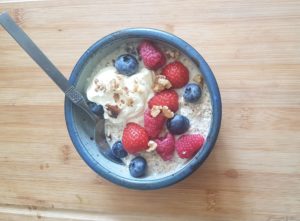 The healthier, tastier alternative to overnight oats and it’s much nicer and more luxurious than ordinary muesli; it’s so good it’s lovely as a dessert too. My social media accounts have been bombarding me with recipes for “overnight oats”. It’s nothing new, I’ve been making it for years but I have always made it with Flax Porridge – well I would wouldn’t I? It’s so much better in so many ways!! Many people make overnight oats to be certain they get a good breakfast. If you use Flax Porridge or Muesli it makes a much healthier, better balanced breakfast and it’s delicious. During all my years of doing stalls at farmers’ markets and Borough Market overnight Flax and Oats was a brilliant breakfast that kept me going all day without the temptation to snack. I still make it now when going on an early car journey. It’s good to have a really nutritious, sustaining meal when you are out instead of buying expensive unhealthy options. I also love to have a bowl of this waiting for me as a recovery meal after a day out with the dogs. It is always such a treat.