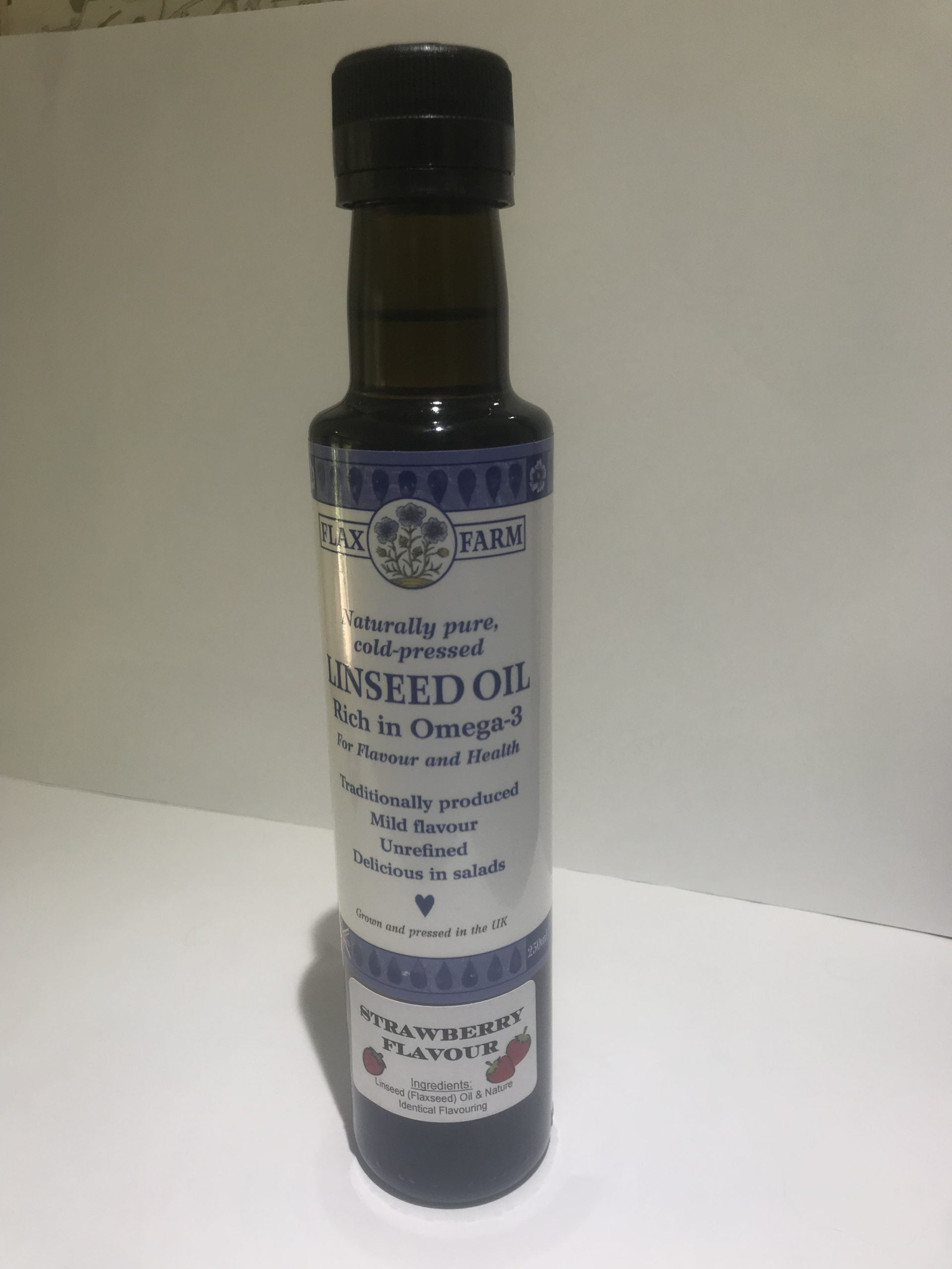 Fresh cold-pressed linseed oil of exceptional quality and a STRAWBERRY flavour, Flax Farm’s cold-pressed linseed oil – which is the same as flax seed oil – is the perfect source Omega-3 with those all-important antioxidants for today’s busy lifestyle.
